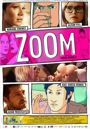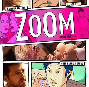 Zoom é um grande exercício metalinguístico. Sua trama, repleta de referências pop, conta com três histórias paralelas que utilizam como ligação a arte e o sexo. A temática principal fica clara em seus momentos iniciais, quando acompanhamos a confecção de uma boneca erótica em paralelo com uma cena de sexo.