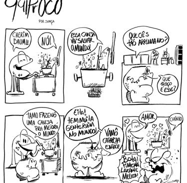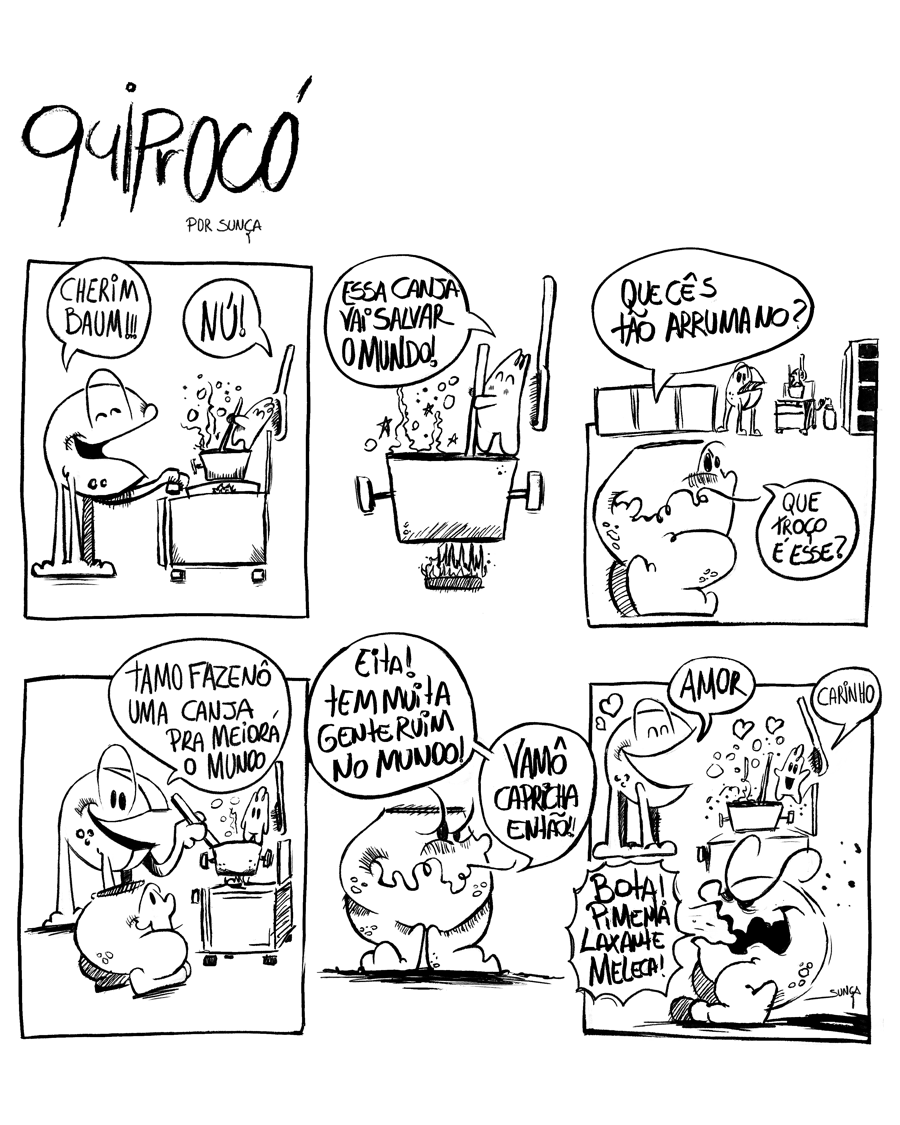 “Quiprocó” é um rabisco da mineiridade. Tiras com muito furdunço e personagens doidimais. Já pensô em salvá o mundo com uma canja? É trem bão demais da conta, sô! É uma delícia pros fãs de quadrinhos e pra quem gosta de quitutes. Os rabiscos do Sunça tem um jeitim mineiro, com tudo quanto é gíria e costumes de Minas.