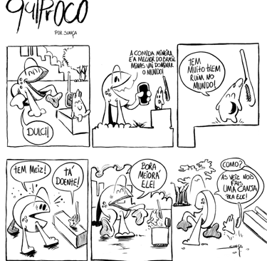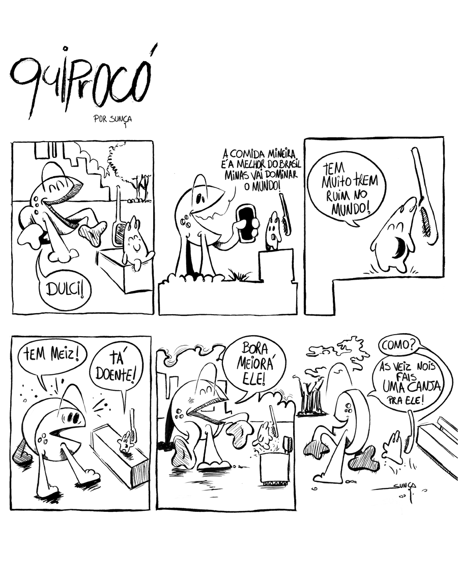 “Quiprocó” é um rabisco da mineiridade. Tiras com muito furdunço e personagens doidimais. Já pensô em salvá o mundo com uma canja? É trem bão demais da conta, sô! É uma delícia pros fãs de quadrinhos e pra quem gosta de quitutes. Os rabiscos do Sunça tem um jeitim mineiro, com tudo quanto é gíria e costumes de Minas.